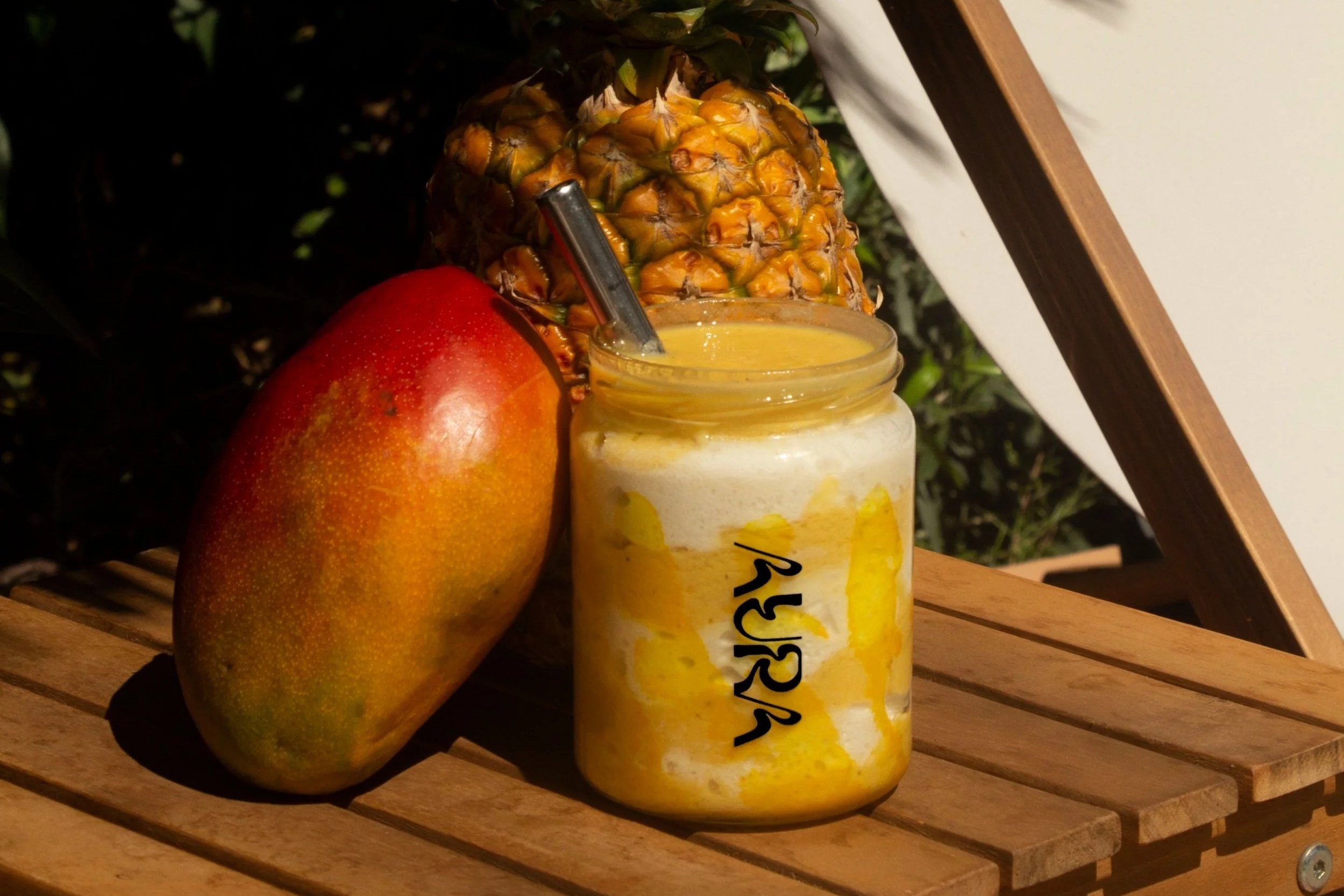 That’s exactly why it’s in BLISS at Aura: a smoothie built around a nervous-system reset, not a “sleepy tea” moment. On our menu, BLISS is pineapple, mango, banana, almond milk, vanilla protein, turmeric, dandelion root extract, CBD drops, ashwagandha, and homemade coconut whipped cream.